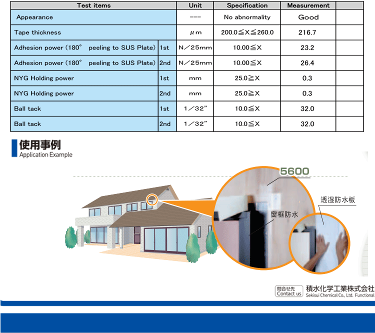 3.以往的橡膠化瀝青類、丁基橡膠類粘合劑膠帶,其中所含的軟化材料會(huì)滲出,使透濕防水板膨脹,影響板材。4.積水丙烯酸防水膠帶解決了上述問(wèn)題,可以放心使用。